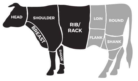 The ribs from the plate are the most richly marbled on the steer, and can be smoked, slow roasted, or braised. These cuts are in general quite rich and succulent.